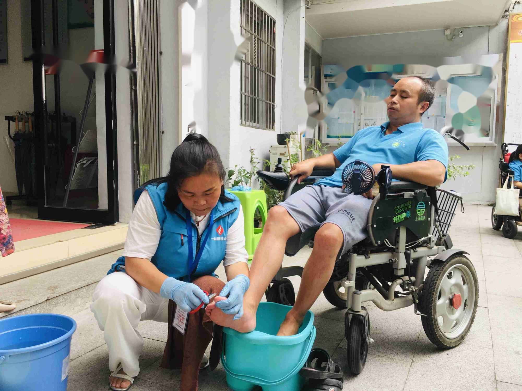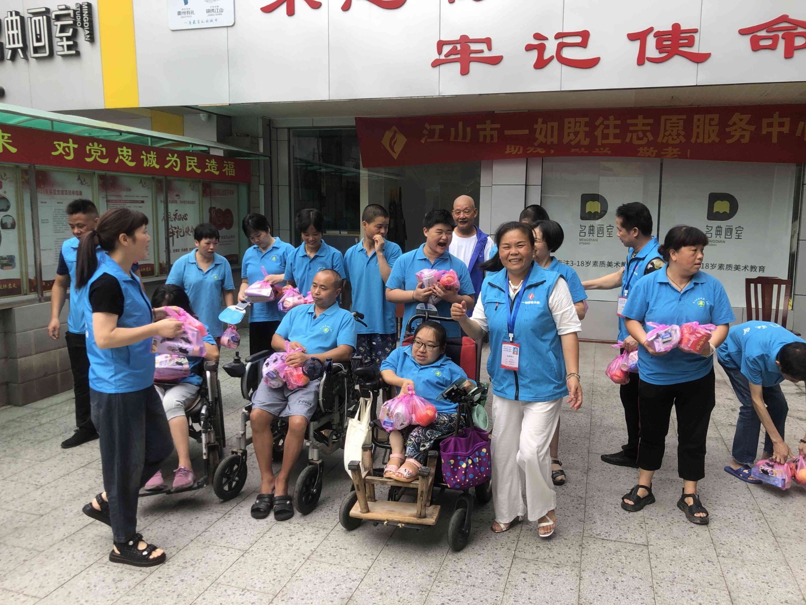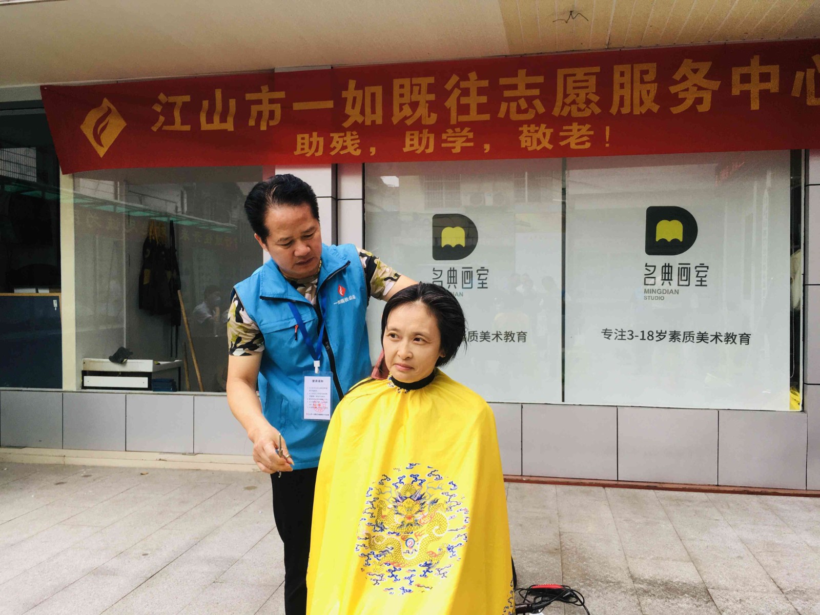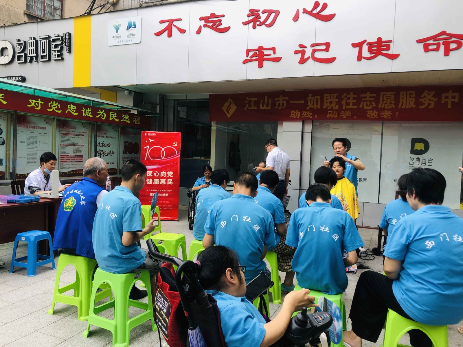 2021年7月19日,江山市一如既往志愿服务中心志愿者们走进江山市西门社区残疾人之家给残疾朋友免费理发,送上生活用品和降温饮料。江山邦尔骨科医院医生给她们免费量血压。