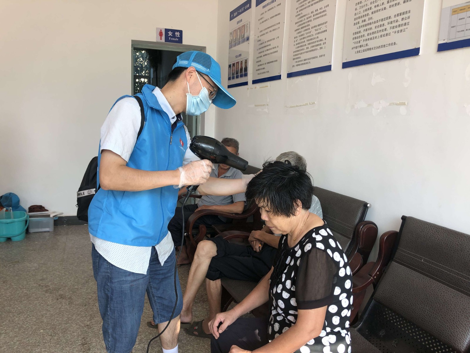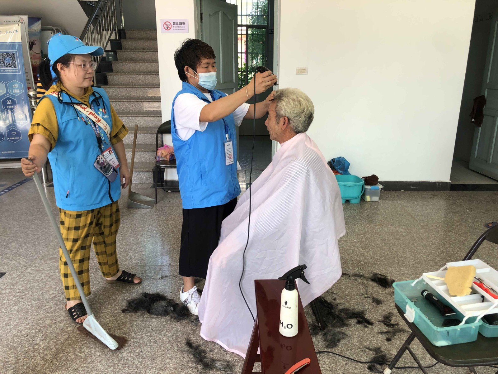 2021年9月26日,江山市一如既往志愿服务中心志愿者们走进江山市贺村镇富益村,给他们洗头理发、测量血压、剪指甲。