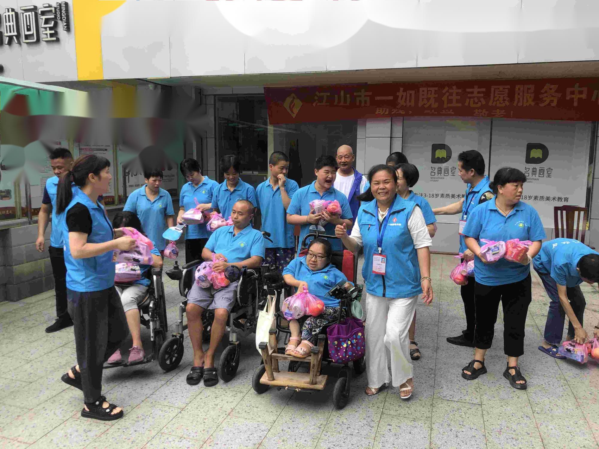2021年7月19日,江山市一如既往志愿服务中心志愿者们走进江山市西门社区残疾人之家给残疾朋友免费理发,送上生活用品和降温饮料。江山邦尔骨科医院医生给她们免费量血压。