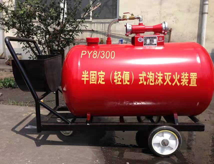 该系统有一部分设备为固定式,可及时启动,另一部分是不固定的,发生火灾时,进入现场与固定设备组成灭火系统灭火。根据固定安装的设备不同,有两种形式:一种为设有固定的泡沫产生装置,泡沫混合液管道、阀门。当发生火灾时,泡沫混合液由泡沫消防车或机动泵通过水带从预留的接口进入。另一种为设有固定的泡沫消防泵站和相应的管道,灭火时,通过水带将移动的泡沫产生装置与固定的管道相连,组成灭火系统。(由消防车及消防水带与固定的泡沫产生器相连接或由固定的泡沫站及消防水带、泡沫管或钩管等组成的泡沫灭火系统……